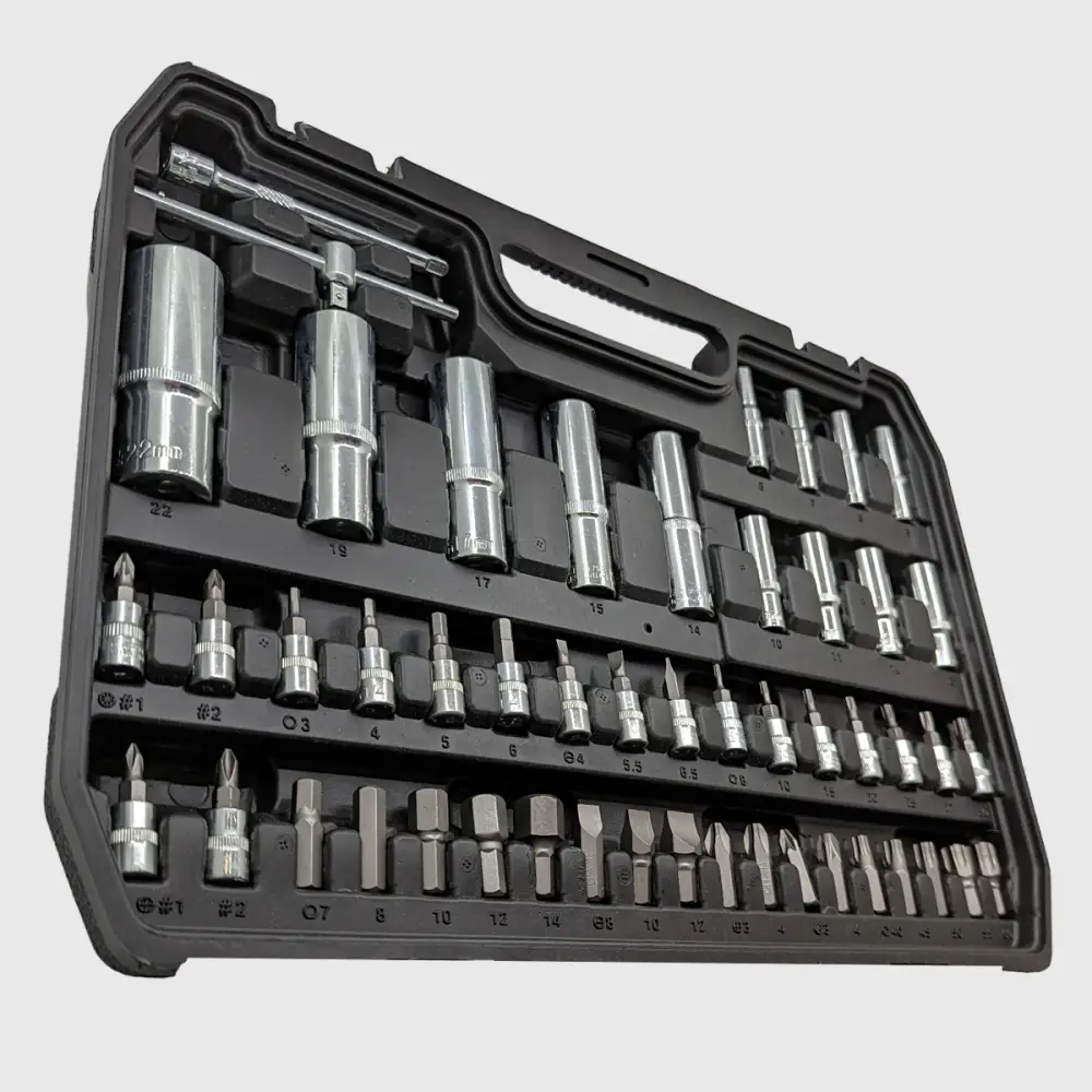 Onze TorqueMaster is een 108-delige gereedschapsset van gehard chroom-vanadiumstaal – dé set voor iedereen die kracht, precisie en veelzijdigheid nodig heeft in de werkplaats of thuis. Dankzij het uitgebreide assortiment doppen, bits en ratels ben je voorbereid op elke klus, groot of klein.