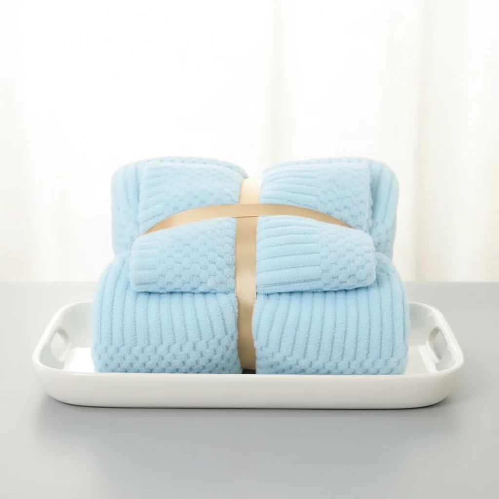 Vervelende, krassende handdoeken en langzame droging kunnen de dagelijkse routine vermoeiend maken. Deze set lost het probleem op met een zachte, coralfleece-achtige oppervlakte en uitstekende absorptiecapaciteit. De combinatie van polyester en katoen zorgt voor een fluweelachtig gevoel op de huid. Dankzij het lichte ontwerp droog je snel af zonder zwaar volume.