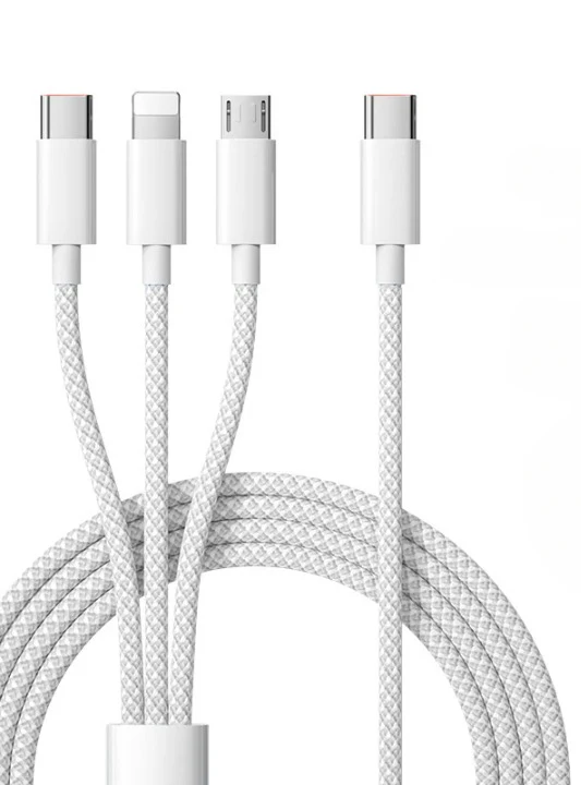 Deze 3-in-1 kabel ondersteunt USB-C, Lightning en Micro USB, waardoor hij perfect is voor telefoons, tablets en accessoires. Met tot 100W snelladen werkt hij met Huawei SuperCharge, iPhone snelladen, Samsung, Xiaomi, OPPO en meer. Het gevlochten ontwerp met aluminiumlegering-uiteinden zorgt voor duurzaamheid en veiligheid.