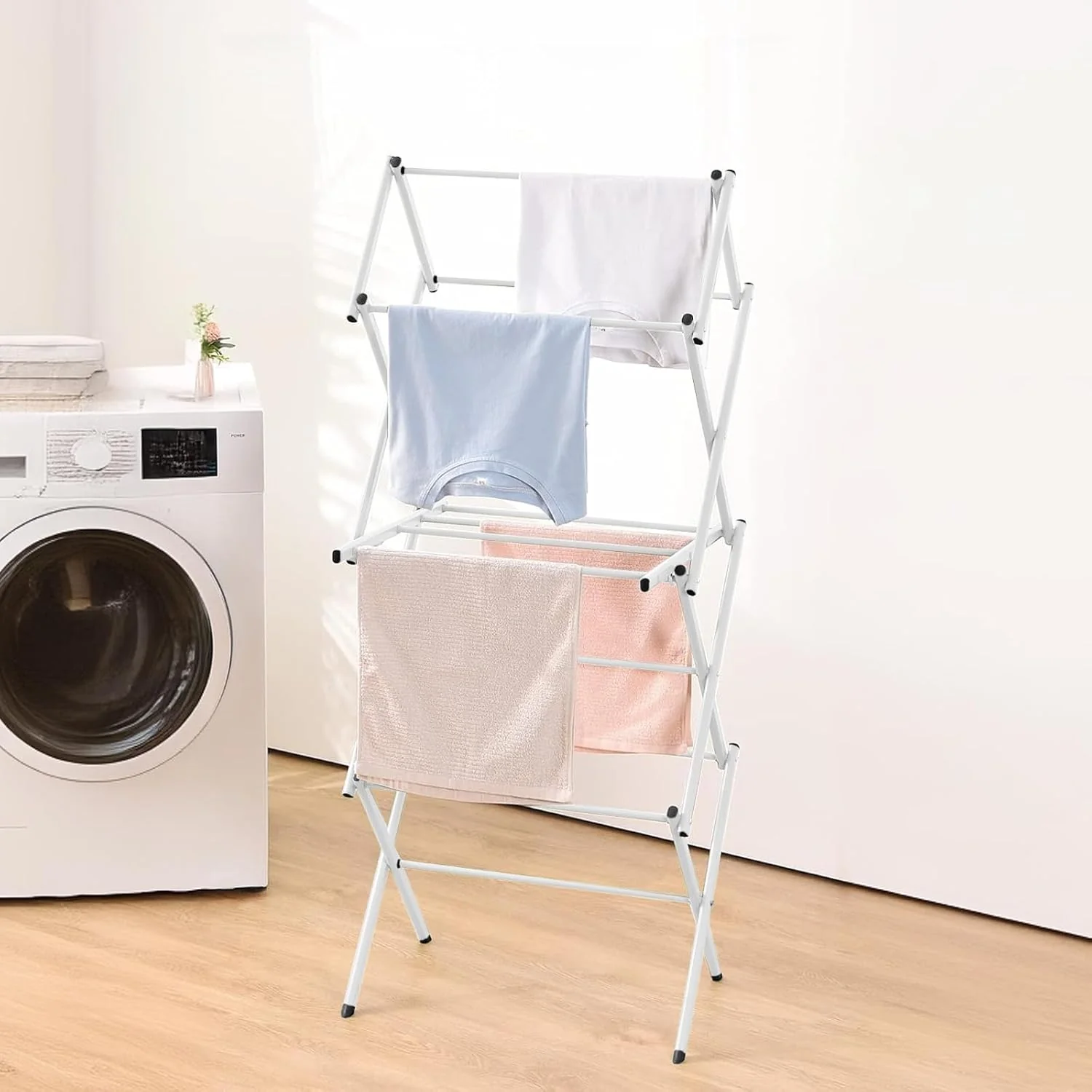 Gemaakt van ijzer met een beschermende coating en stevige PP-kunststof. Dit rek is duurzaam en waterdicht. Het vouwt eenvoudig met een trekbeweging voor compacte opslag en kan worden uitgebreid om meer kleding, handdoeken of schoenen te bevatten. De multi-paalstructuur zorgt voor stabiele ondersteuning terwijl het lichtgewicht blijft voor gemakkelijke mobiliteit.