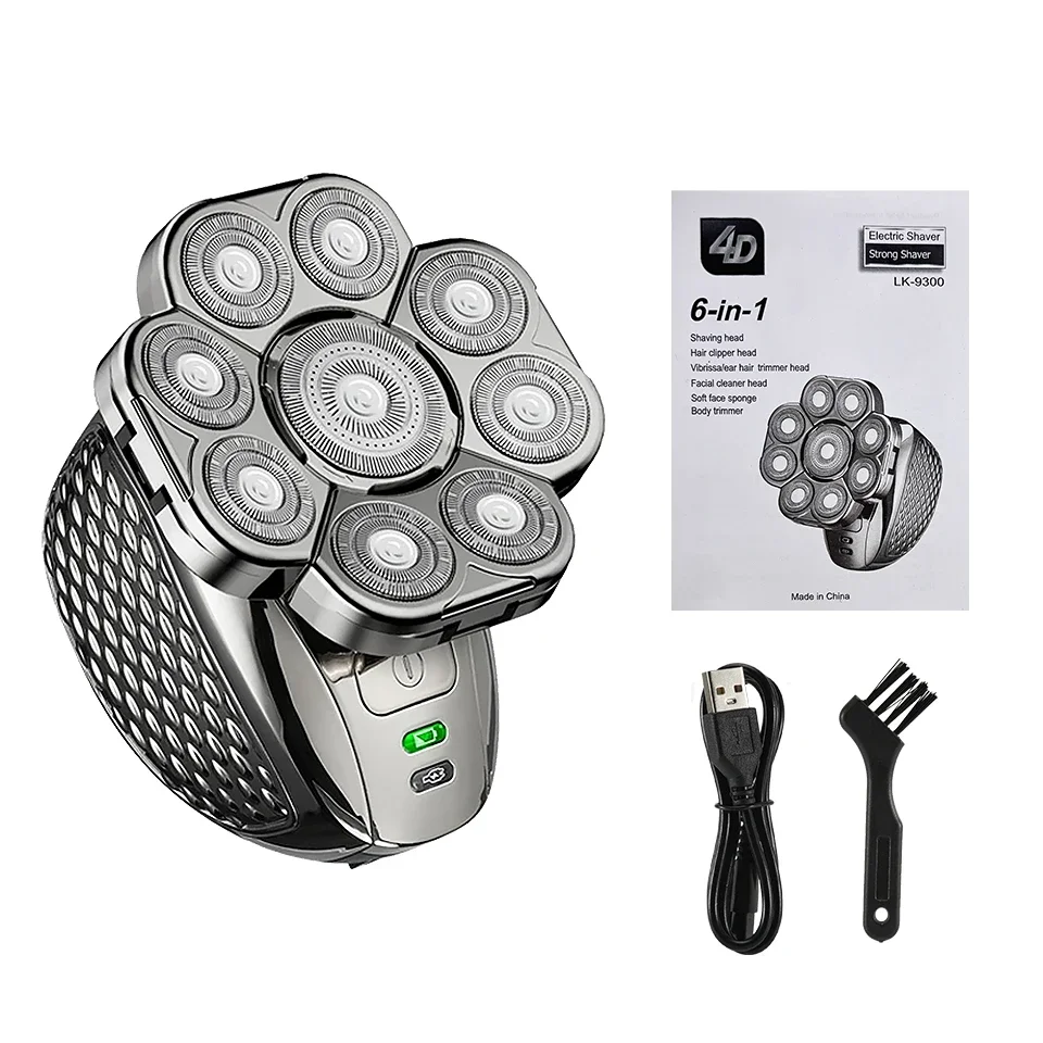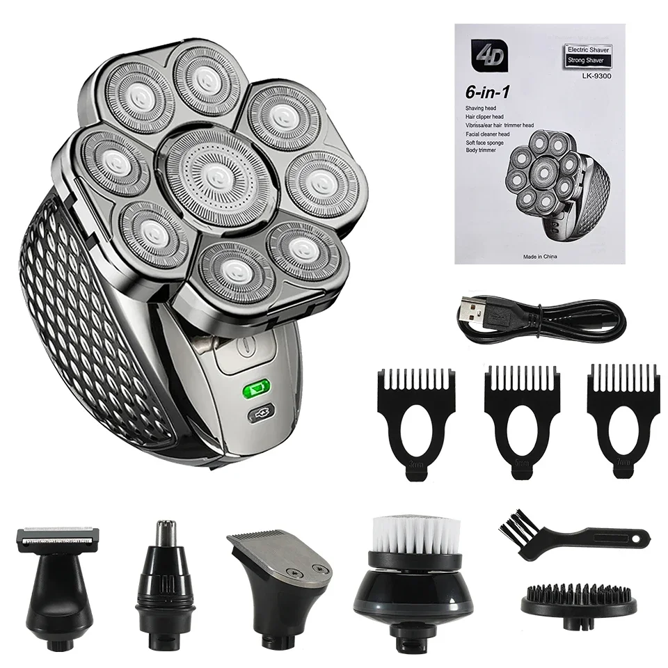 - (6-in-1 versie) Elektrisch scheerapparaat, baardtrimmer, 3 geleidingskammen, neustrimmer, bodytrimmer, reinigingsborstel, siliconen massageborstel, USB-kabel, gebruikershandleiding