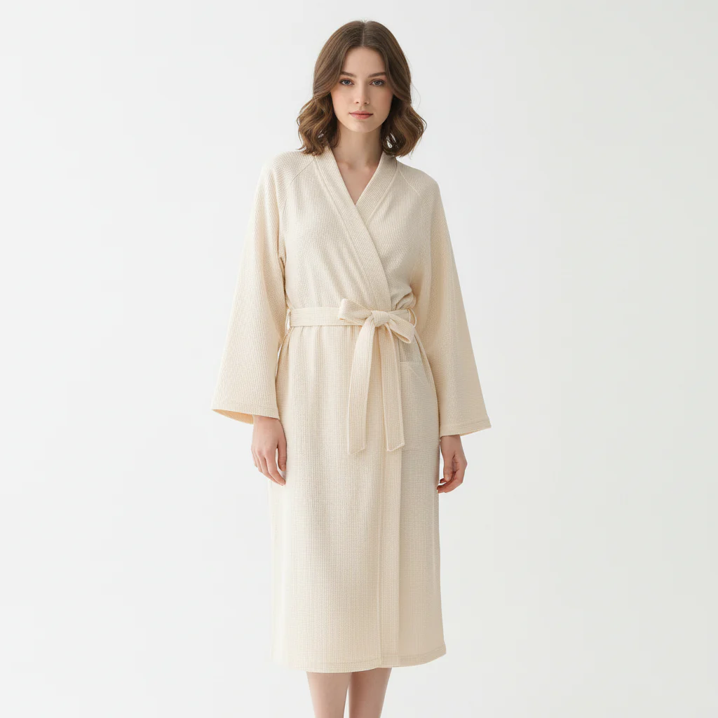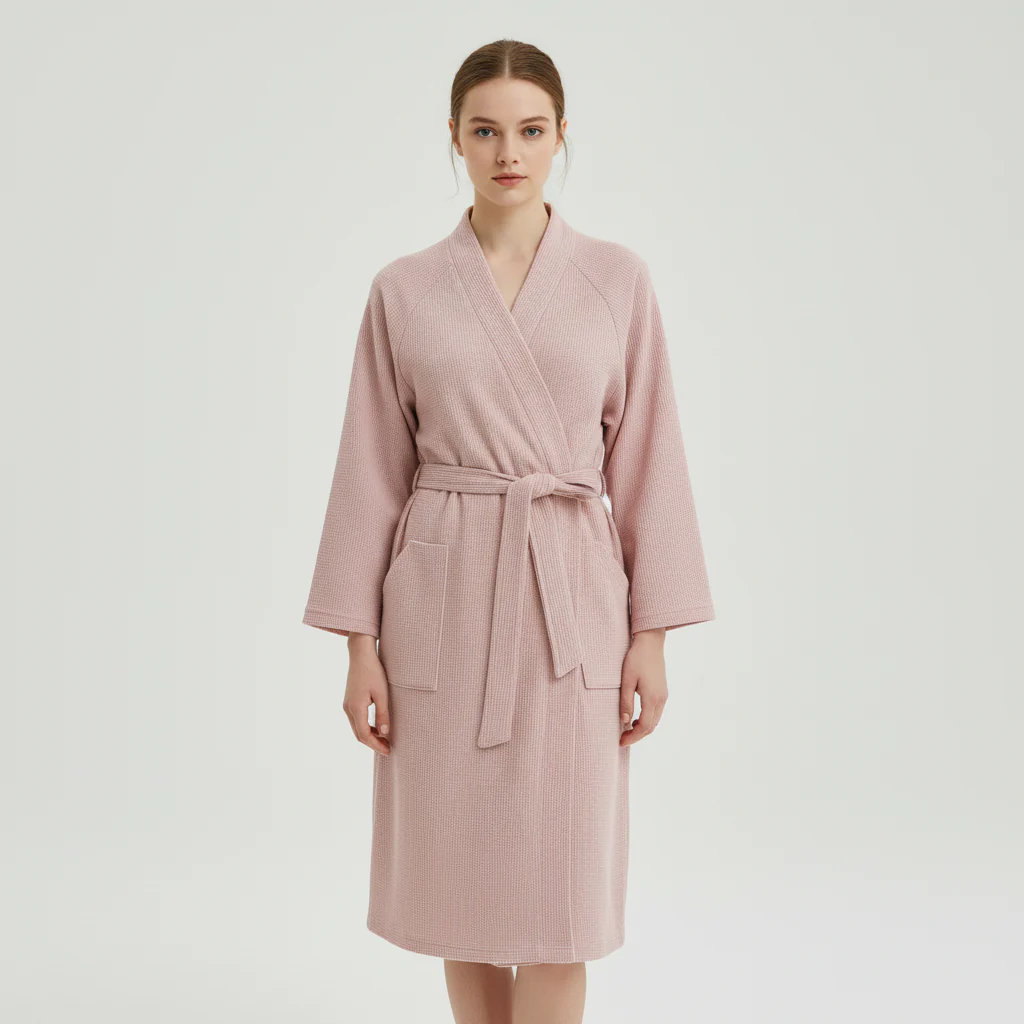 De badjas is gemaakt van zachte, ademende stof. Dit zorgt de hele dag voor een prettig draaggevoel.