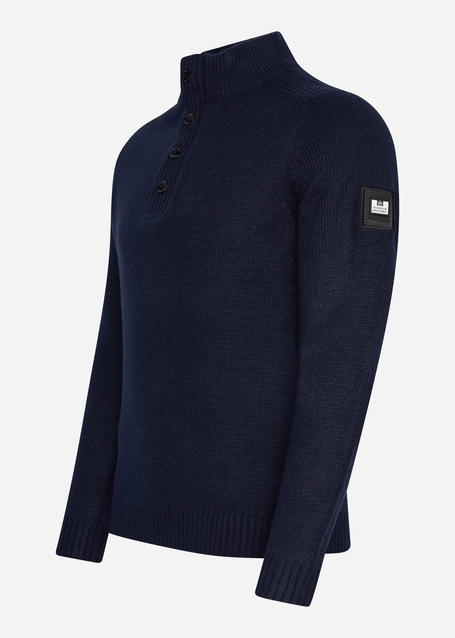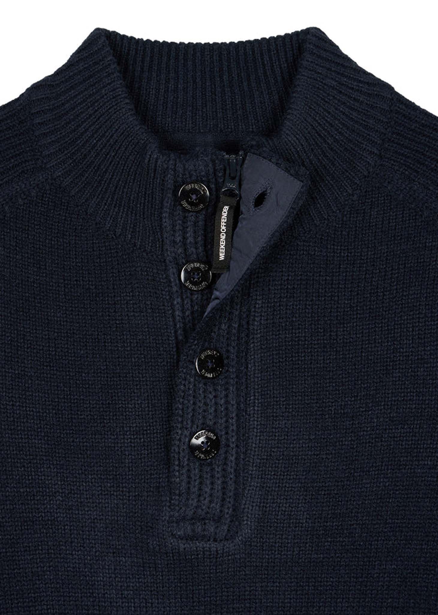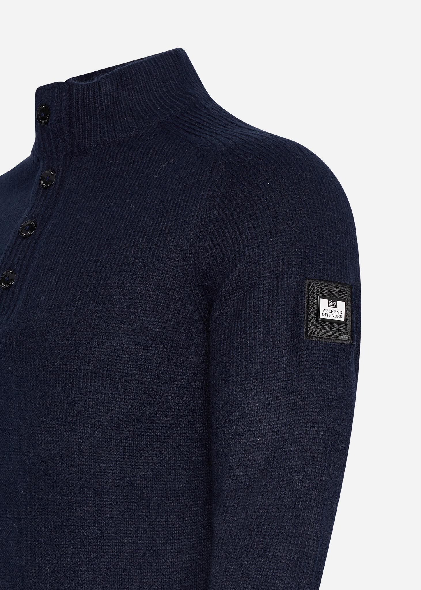 De trui is gemaakt van 70% acryl en 30% wol. Op de rechtermouw is het Weekend Offender logo bevestigd.