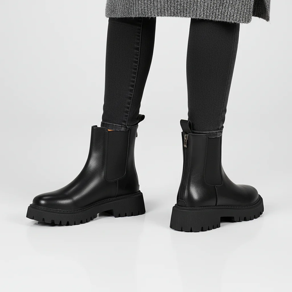 Het juiste paar laarzen vinden dat comfortabel is en bij elke outfit past, kan frustrerend zijn. Deze Chelsea laarzen lossen het probleem op met een ruime ronde neus en een soepele rits aan de achterkant voor eenvoudig aan- en uittrekken. De dikke profielzool biedt betrouwbare grip en zorgt ervoor dat jij veilig kunt lopen op verschillende ondergronden. Het Brits geïnspireerde design geeft elke look een verfijnde touch zonder concessies te doen aan moderne details.