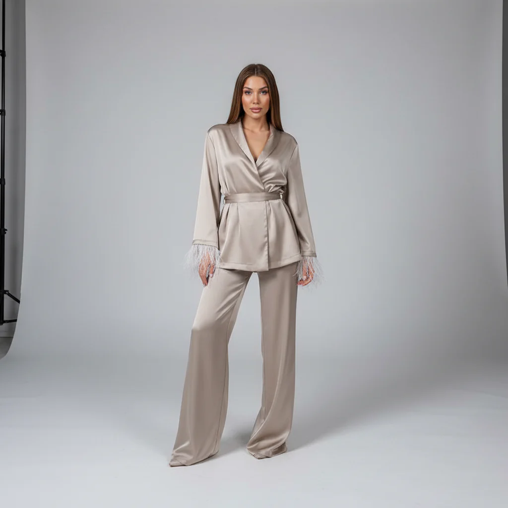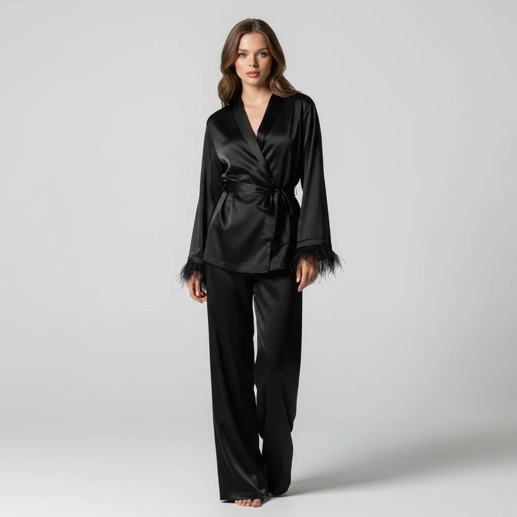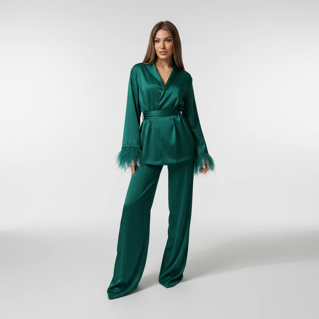 Het is moeilijk om een comfortabele look te vinden die tegelijkertijd stijlvol is. Dit setje combineert de zachte charme van satijn met een comfortabele, losse pasvorm. Het ontwerp met opvallende veren geeft je een unieke uitstraling, perfect voor relaxed dagen of logeerpartijtjes bij vrienden. Je zult het geweldig vinden hoe het soepel om jouw lichaam valt, zonder te knellen.