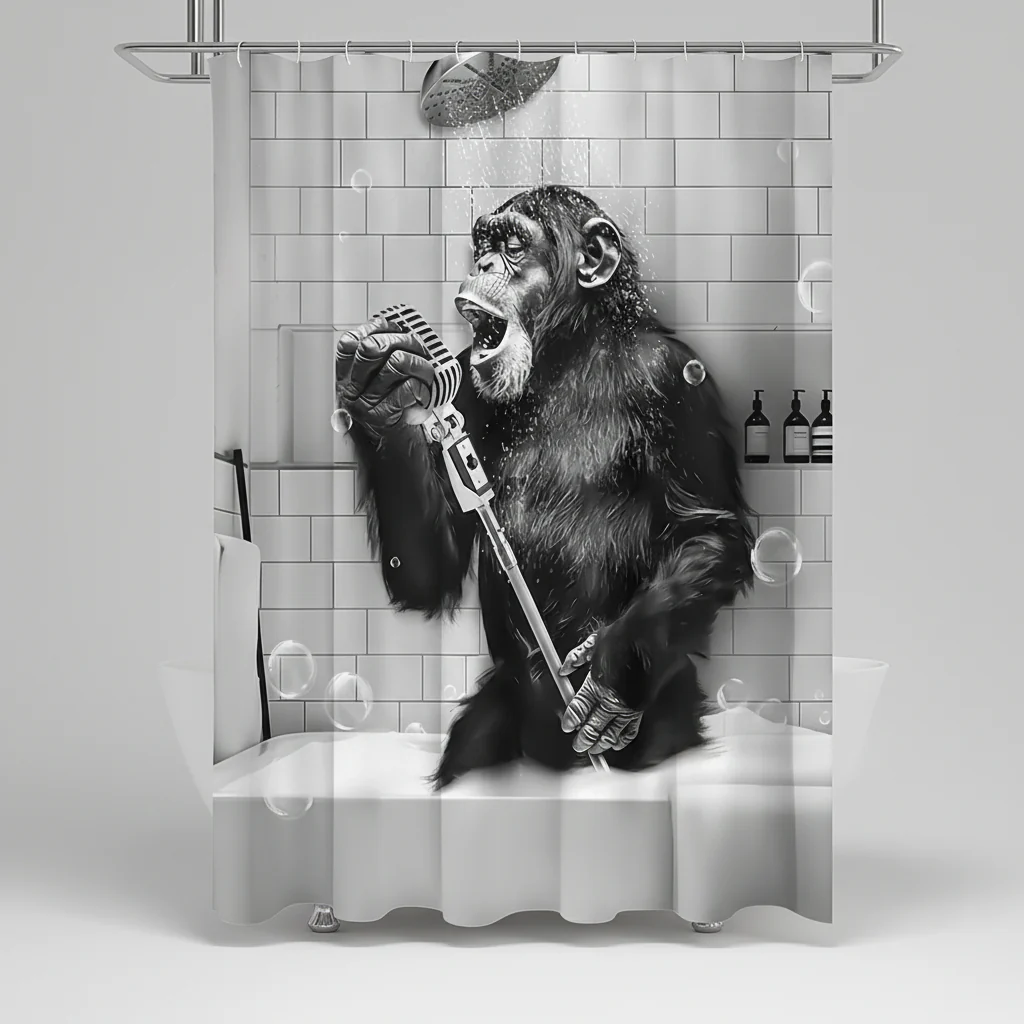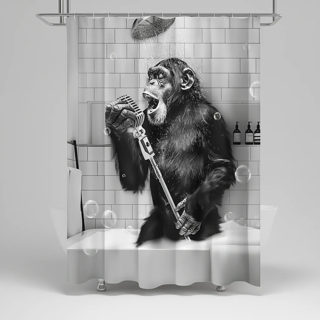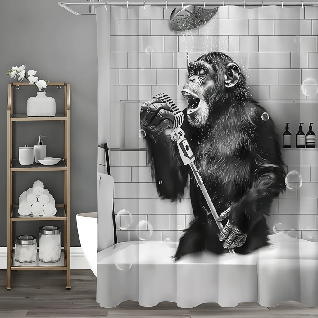 Een saaie badkamer kan de stemming verlagen en de start van de dag verpesten. Dit douchegordijn lost het probleem op met een opvallend zwart-wit motief van een zingende aap in de badkuip en zorgt onmiddellijk voor sfeer. De waterafstotende oppervlakte houdt spetters op afstand en beschermt de ruimte betrouwbaar. Robuust verwerkt materiaal vergemakkelijkt het onderhoud en blijft langdurig mooi in vorm.